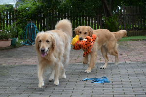 さて、この暑さの中、サニーとアイビー(?)は元気いっぱいです。ぬいぐるみの引っ張りっこで仲良く?遊んでいます。