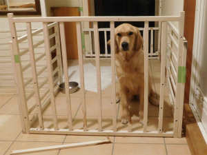 一週間は安静にさせておかなくてはと思い、代々の犬達に使っていベビーベットで柵を作ったところ、サニーはやってくれました!脱出大作戦です!退屈だったのか見事に木製の柵を噛み砕いてくれました。出ようと思えば出れるのにキョトンとす座っていましたよ・・・