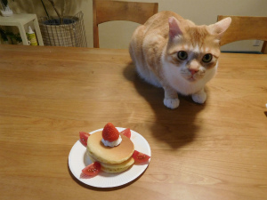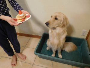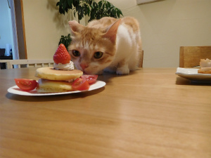 なぜかトラオ君が狙っています。(となりにさつま揚げがあるのに、ケーキの方がいいみたい・・・)