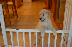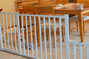 アイビーは初めっからトイレもちゃんとシートにできとてもお利口さんですが、トイレの失敗をなるべくさせないため行き来できる場所を制限しています。ローズの時にも利用していた子供達のおさがりのベビーベットで柵を作りました。